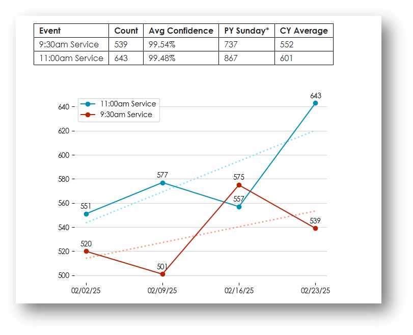 Looking at 4-week, 12-week, and 12-month trends helps churches see growth patterns, seasonal shifts, and long-term momentum. Instead of reacting to a single high or low week, leaders can base decisions on stable trends and real capacity data.